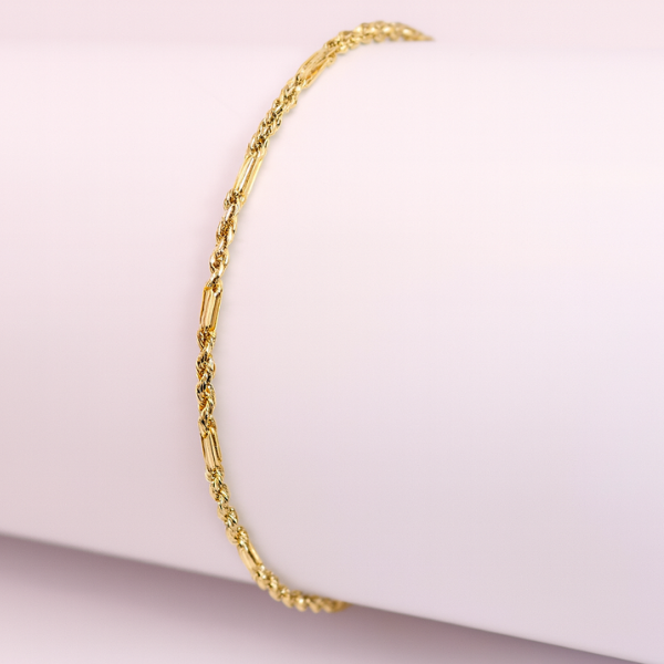 Un diseño delicado con un brillo único. Esta pulsera en oro de 10 quilates luce un trenzado estilo Singapur, conocido por su ligereza y movimiento fluido que refleja la luz en cada eslabón. Elegante y versátil, es ideal para llevar sola como un detalle sutil o acompañada de otras pulseras para un look más sofisticado.