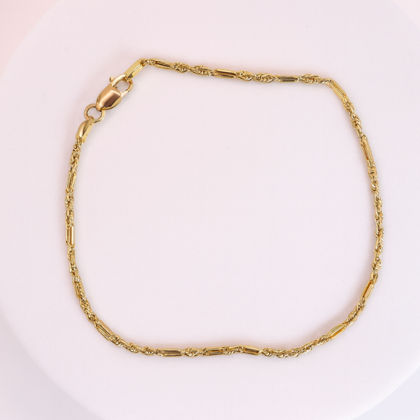 Un diseño delicado con un brillo único. Esta pulsera en oro de 10 quilates luce un trenzado estilo Singapur, conocido por su ligereza y movimiento fluido que refleja la luz en cada eslabón. Elegante y versátil, es ideal para llevar sola como un detalle sutil o acompañada de otras pulseras para un look más sofisticado.